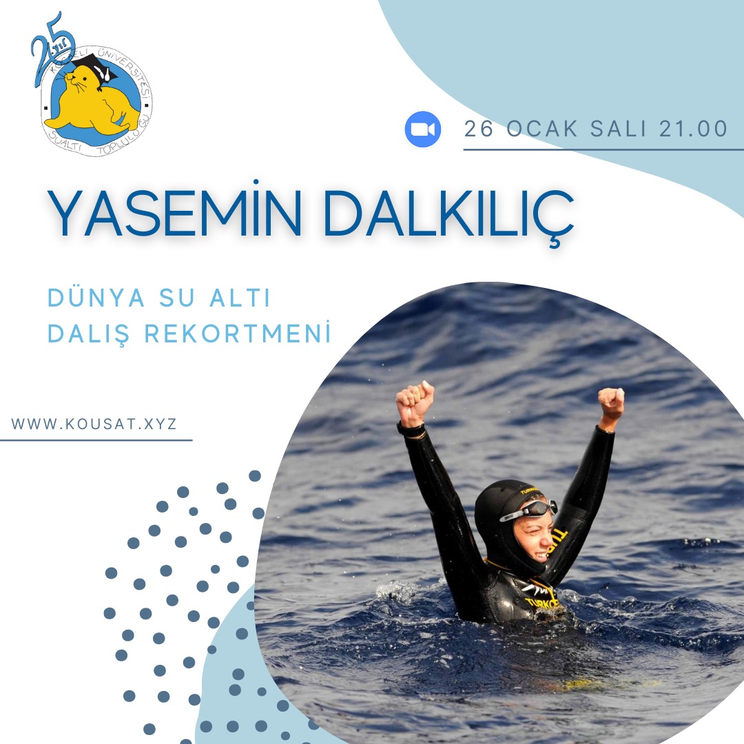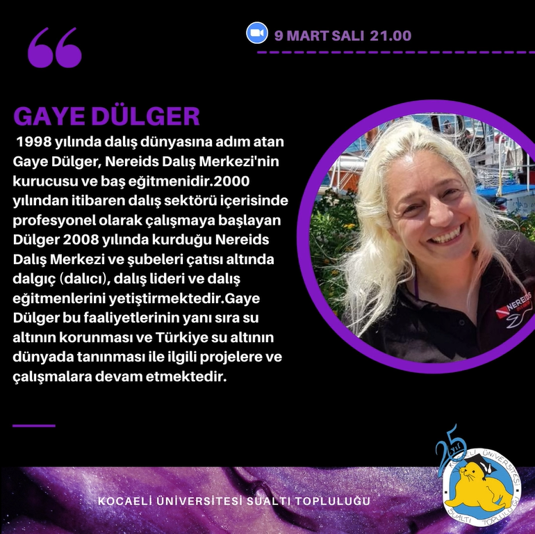 09.03.2021 Salı günü saat 21.00'da Dalış Eğitmen Eğitmeni ve Dalsın Kızlar Projesi Lideri Gaye Dülger ile "Dalış ve Kadın" konulu bir zoom toplantısı gerçekleştireceğiz.