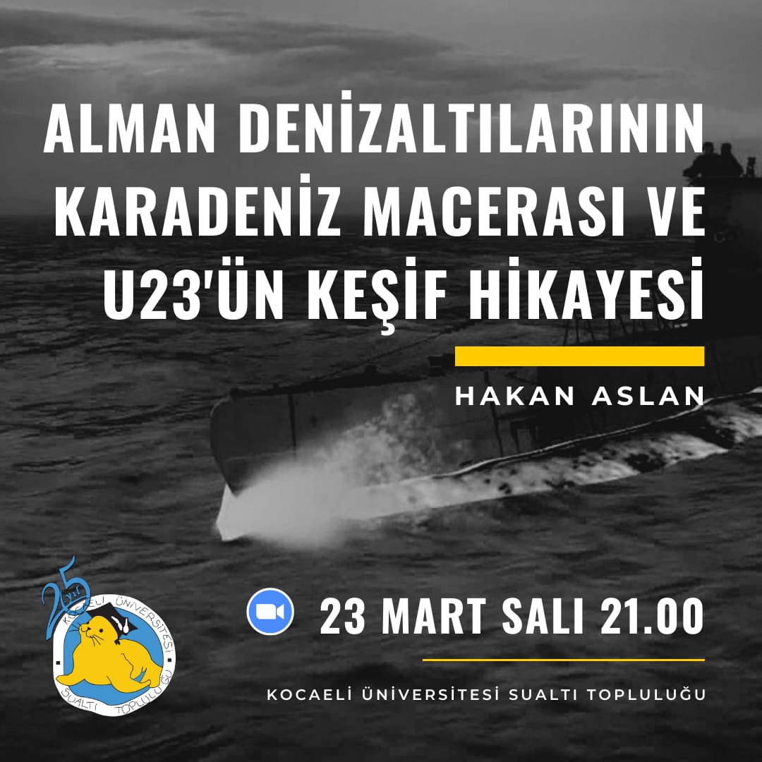 23 Mart Salı günü saat 21.00'da Hakan Aslan ile "ALMAN DENİZALTILARININ KARADENİZ MACERASI VE U23'ÜN KEŞİF HİKAYESİ" konulu bir zoom toplantısı gerçekleştireceğiz.